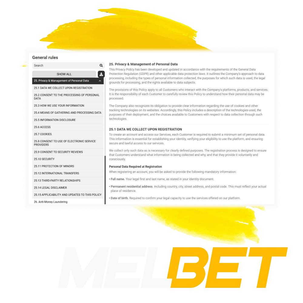 Melbet অফিসিয়াল ওয়েবসাইট গোপনীয়তা নীতি সম্পূর্ণরূপে বর্ণনা করে কিভাবে Melbet ক্লায়েন্ট’ তথ্য ব্যবহার করে। যদি বিষয়বস্তু আপনার ব্যক্তিগত তথ্য বা বিবরণ হয় তবে আমরা সর্বদা গোপনীয়তা নীতি অনুসারে কাজ করি। অ্যাকাউন্ট রেজিস্ট্রেশনের সময় আপনি যখন ওয়েবসাইটের মাধ্যমে আপনার ব্যক্তিগত তথ্য জমা দেন, তখন Melbet বিভিন্ন ক্ষেত্রে তথ্য ব্যবহারের জন্য আপনার সম্মতি পায়। আপনি যদি নীতির সাথে একমত না হন, তাহলে দয়া করে আমাদের ওয়েবসাইট ব্যবহার করবেন না এবং অ্যাকাউন্টটি বন্ধ করে দেবেন।